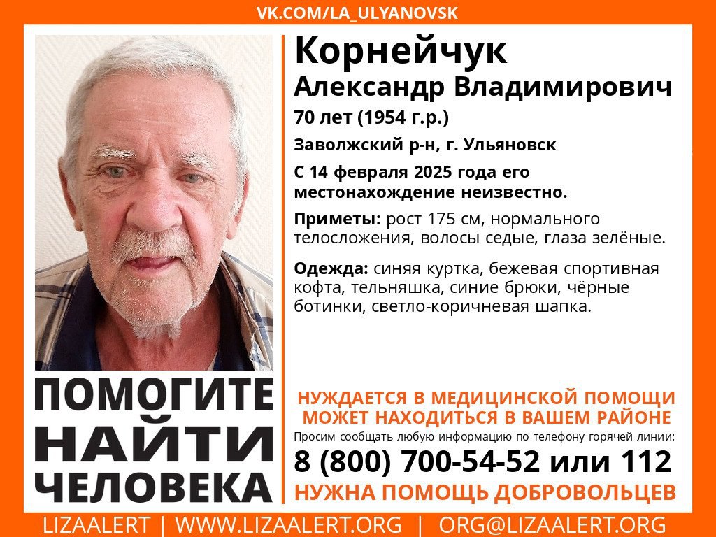 Корнейчук Александр Владимирович, 1954 года рождения. Житель Заволжского района Ульяновска, пропал 14 февраля. Нуждается в медицинской помощи ;