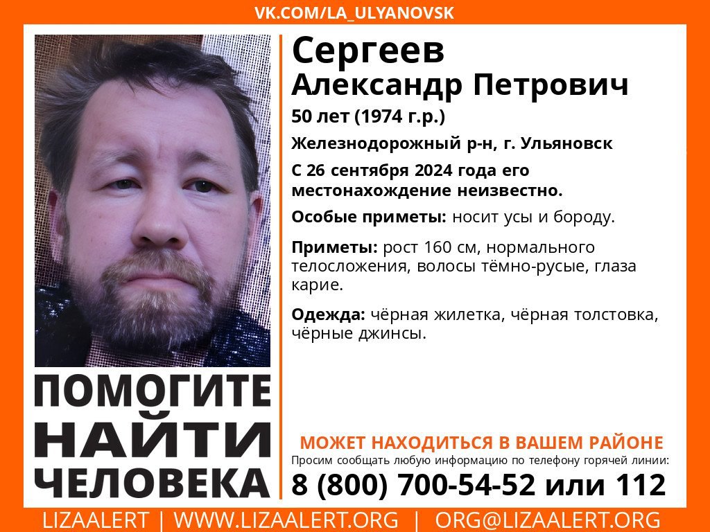 Сергеев Александр Петрович, 1974 года рождения. Пропал 26 сентября 2024 года в Железнодорожном районе Ульяновска. Особые приметы: носит усы и бороду .