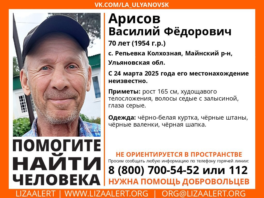 Арисов Василий Федорович, 1954 года рождения. Житель села Репьевка Колхозная Майнского района пропал 24 марта 2025 года. Был одет в черно-белую куртку, черные штаны, черные валенки и черную шапку ;