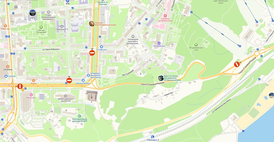— спуск Степана Разина (от площади 30-летия Победы до дома № 23 по спуску Степана Разина, с перекрытием Нового переулка).