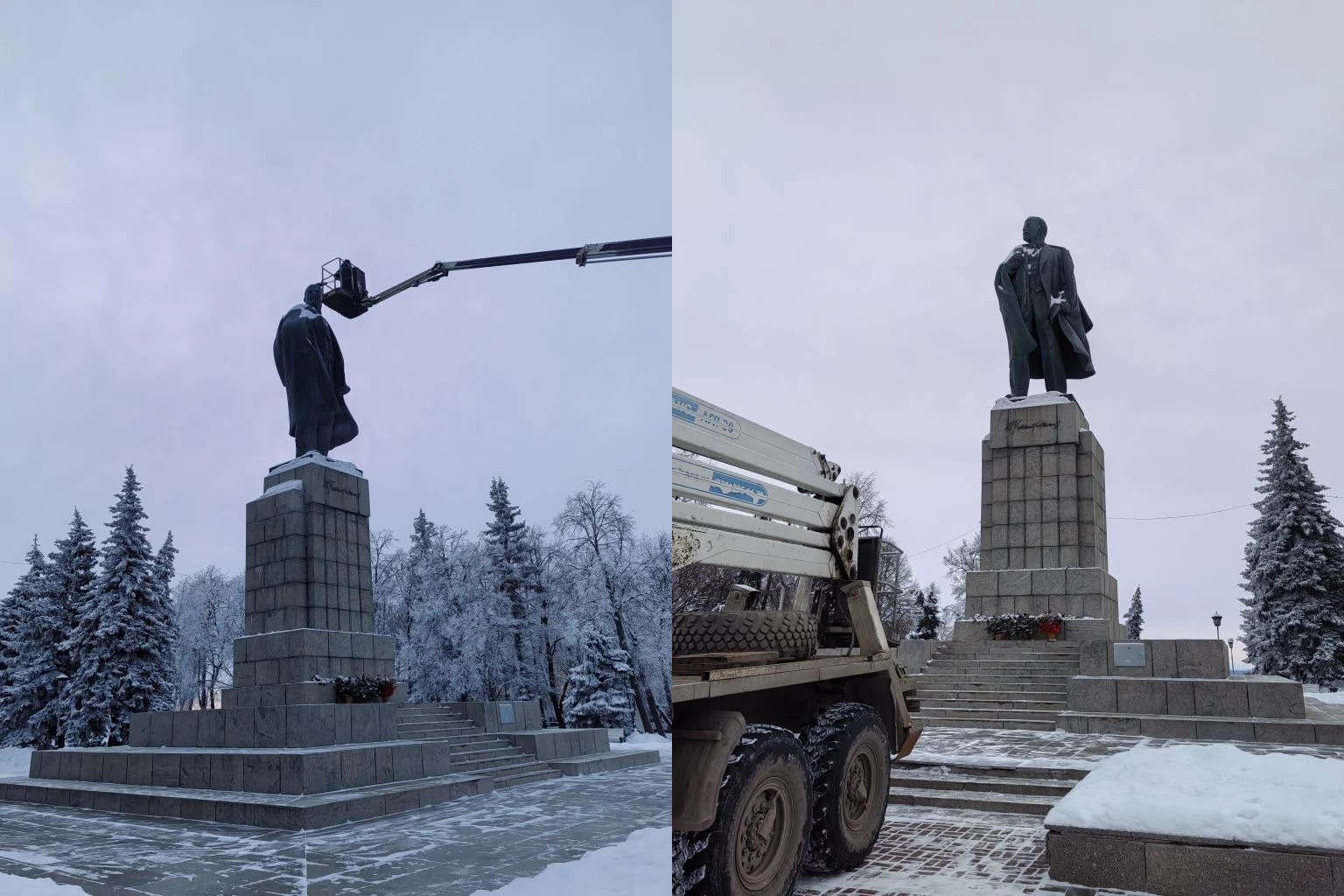 Для проведения работ была задействована автовышка, с помощью которой рабочие аккуратно сняли снежную массу, скопившуюся на скульптуре за время снегопадов.