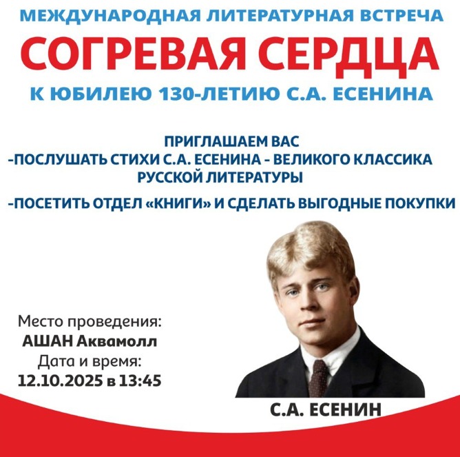 12 октября в 13:45 в ТРЦ «Аквамолл» состоится международная литературная встреча «Согревая сердца». Мероприятие предлагает погрузиться в творческое наследие одного из величайших поэтов Серебряного века.