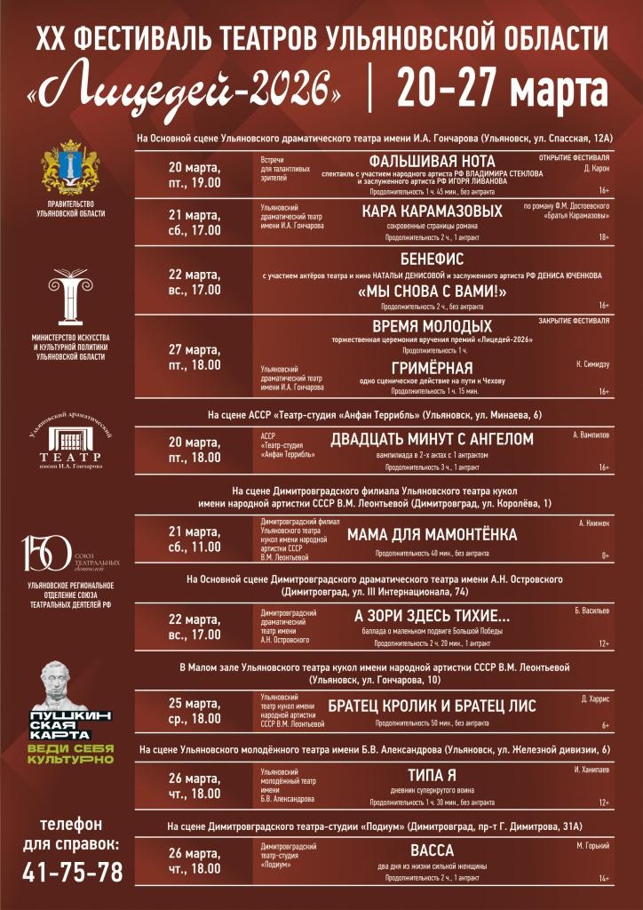 С 20 по 27 марта в Ульяновской области пройдёт XX Фестиваль театров «Лицедей-2026». В этом году он приурочен к 150-летию Союза театральных деятелей России и пройдёт под девизом «Время молодых».