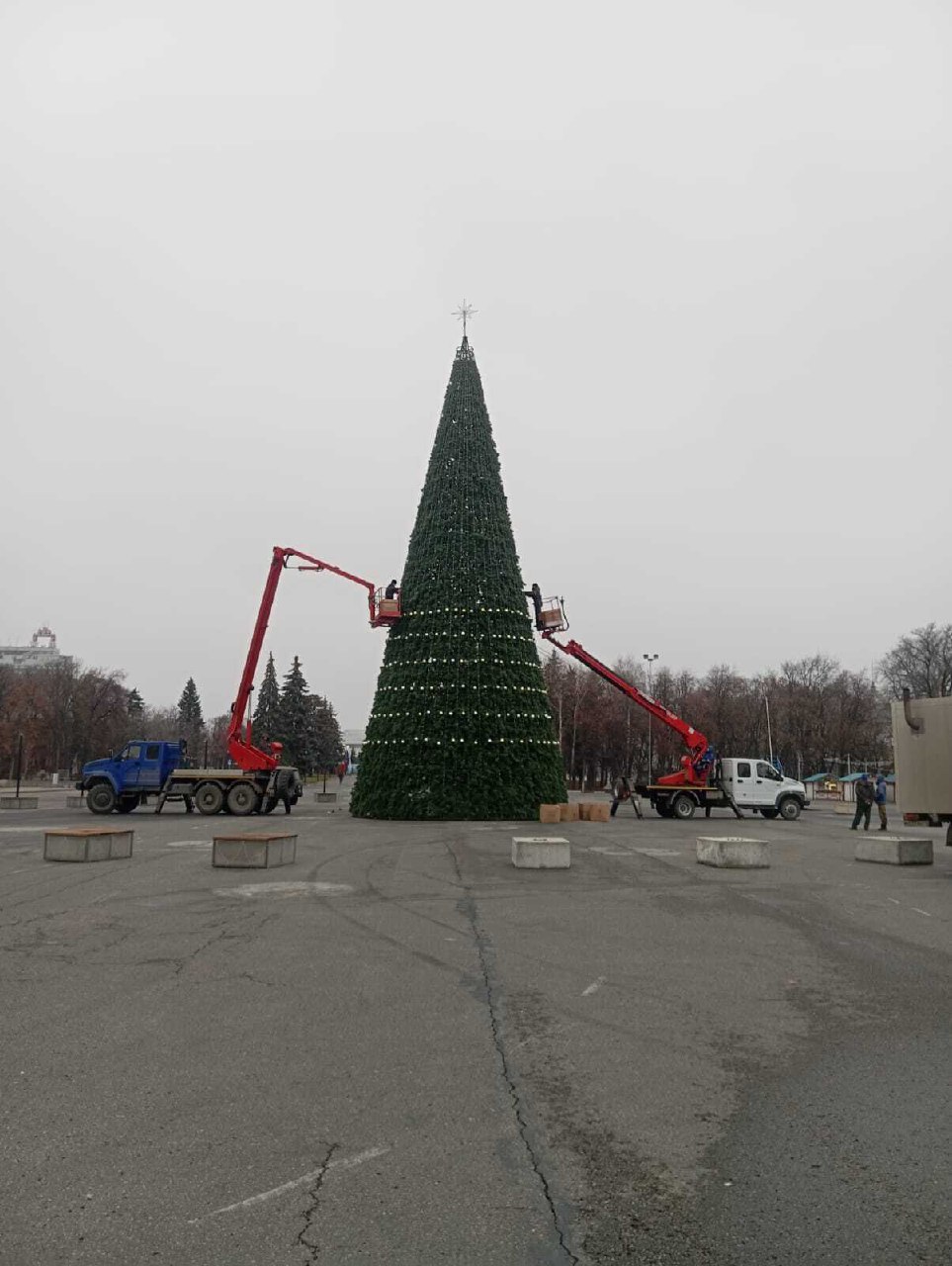 Работы по праздничному освещению уже были выполнены ранее силами муниципального предприятия «Горсвет», которое смонтировало на дереве специальные световые кластеры.