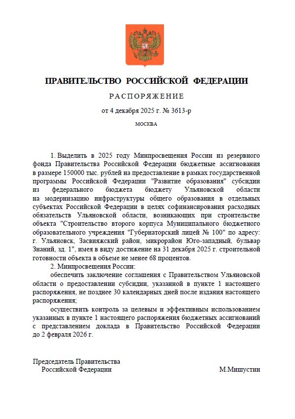 На завершение строительства второго корпуса лицея №100 в Ульяновске из резервного фонда Правительства РФ будет дополнительно выделено 150 миллионов рублей. Соответствующее распоряжение подписал Председатель Правительства Михаил Мишустин.