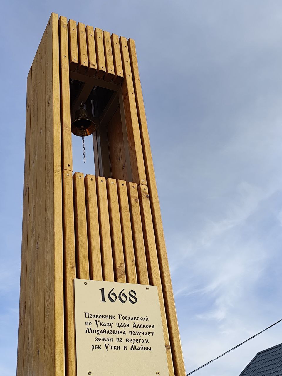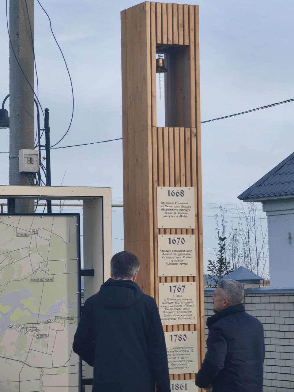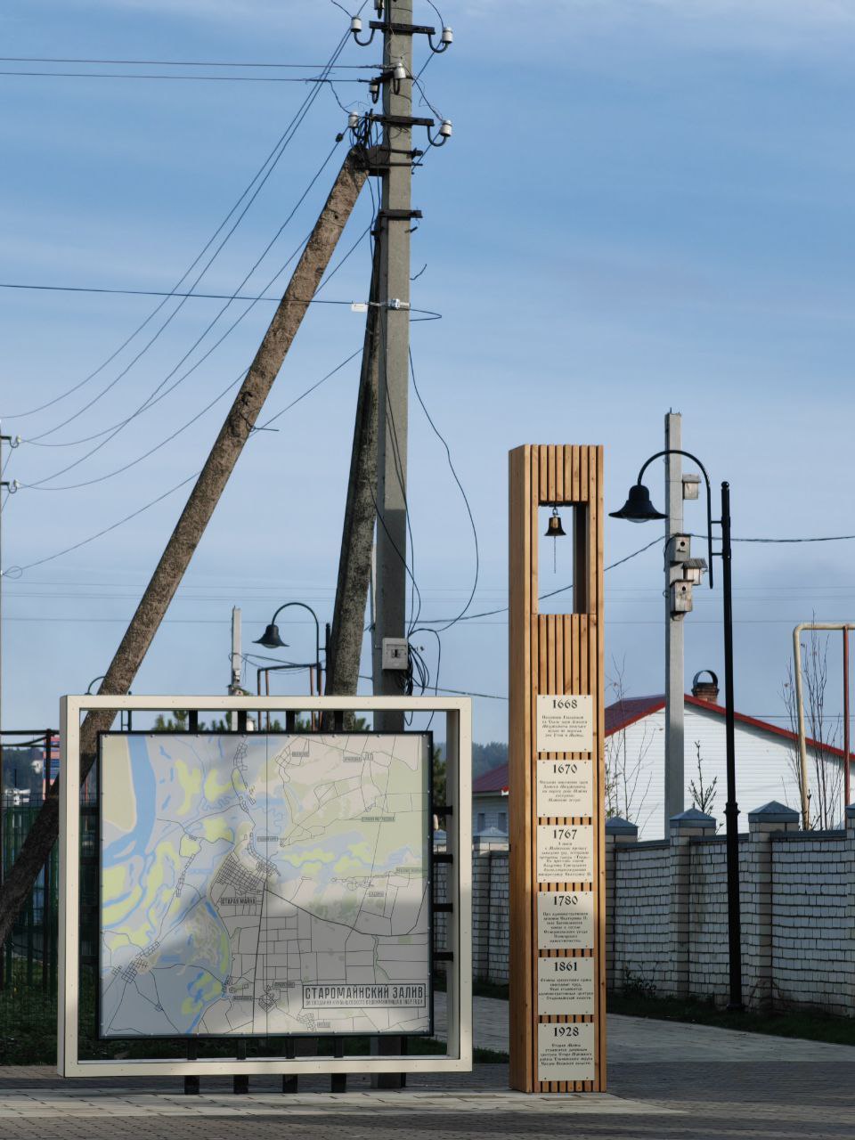 Комплекс включает в себя две ключевые детали. Первая — это карта, которая наглядно показывает, какие именно населенные пункты и территории были затоплены при создании залива. Вторая — памятный столб с колоколом, на котором отмечены основные исторические вехи поселка Старая Майна.