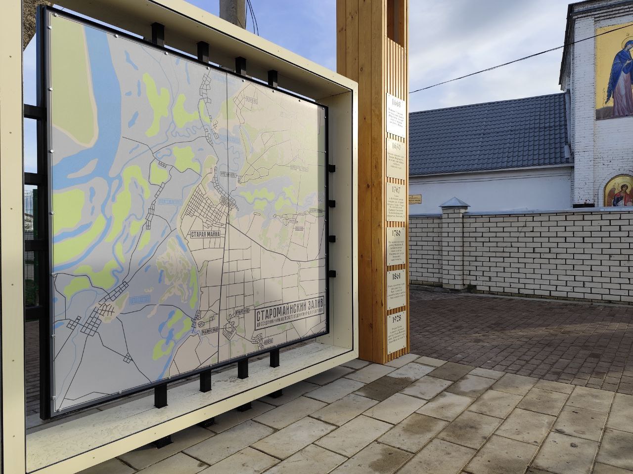 Комплекс включает в себя две ключевые детали. Первая — это карта, которая наглядно показывает, какие именно населенные пункты и территории были затоплены при создании залива. Вторая — памятный столб с колоколом, на котором отмечены основные исторические вехи поселка Старая Майна.
