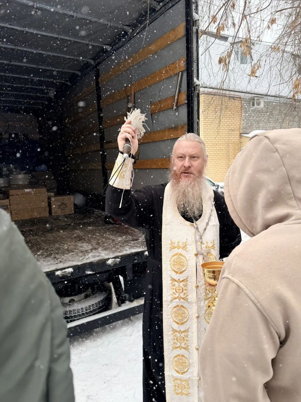 Перед отправкой собранные материалы были освящены. Настоятель Воскресенско-Германовского храма протоиерей Илия Кузнецов совершил чин окропления груза святой водой, благословив его на путь и оказание помощи тем, кто в ней нуждается.