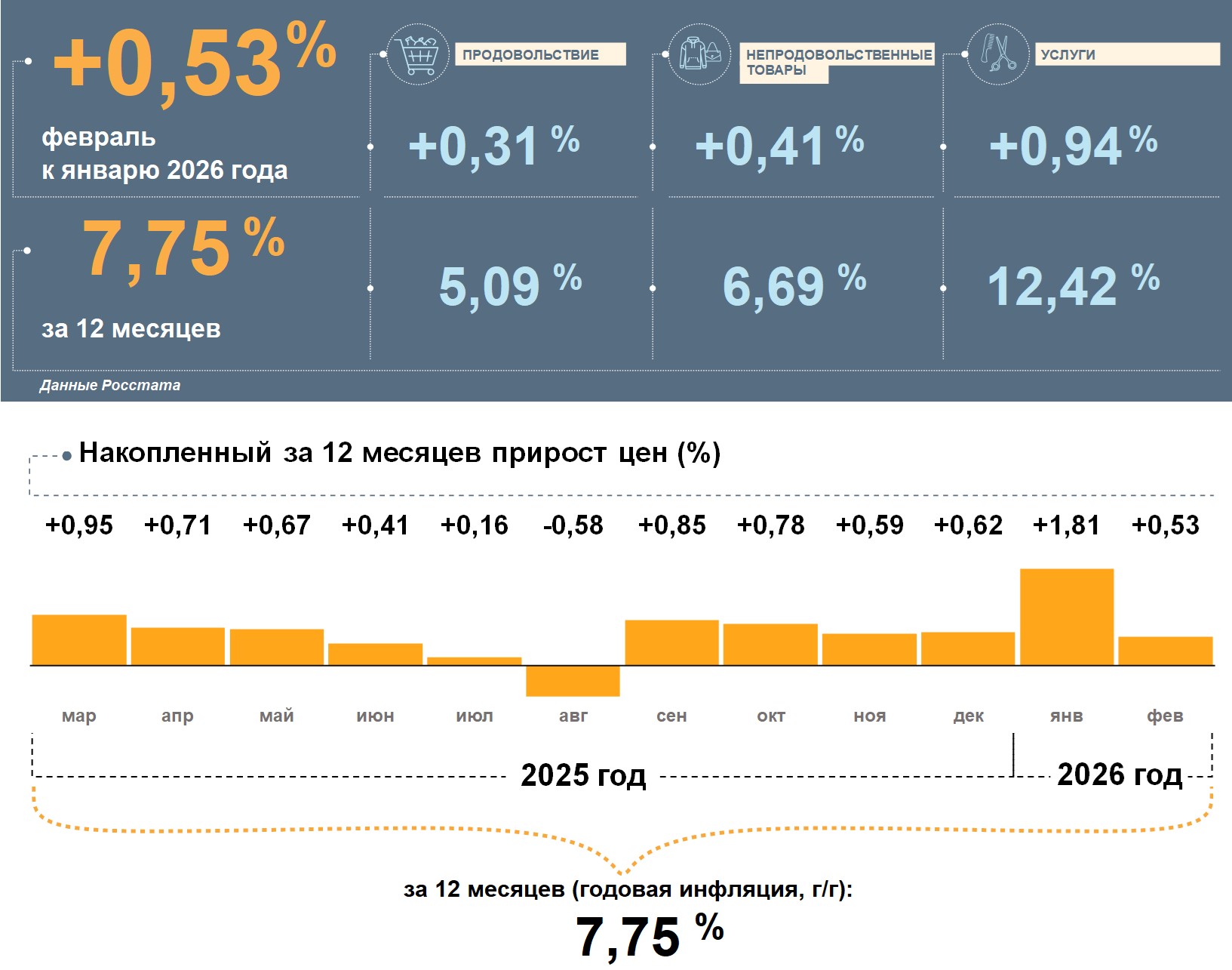 В Ульяновской области замедлился рост цен. По данным Росстата, в феврале 2026 года инфляция составила 7,75% в годовом выражении. Это ниже январских показателей, хотя всё ещё выше среднероссийского уровня (5,91%).