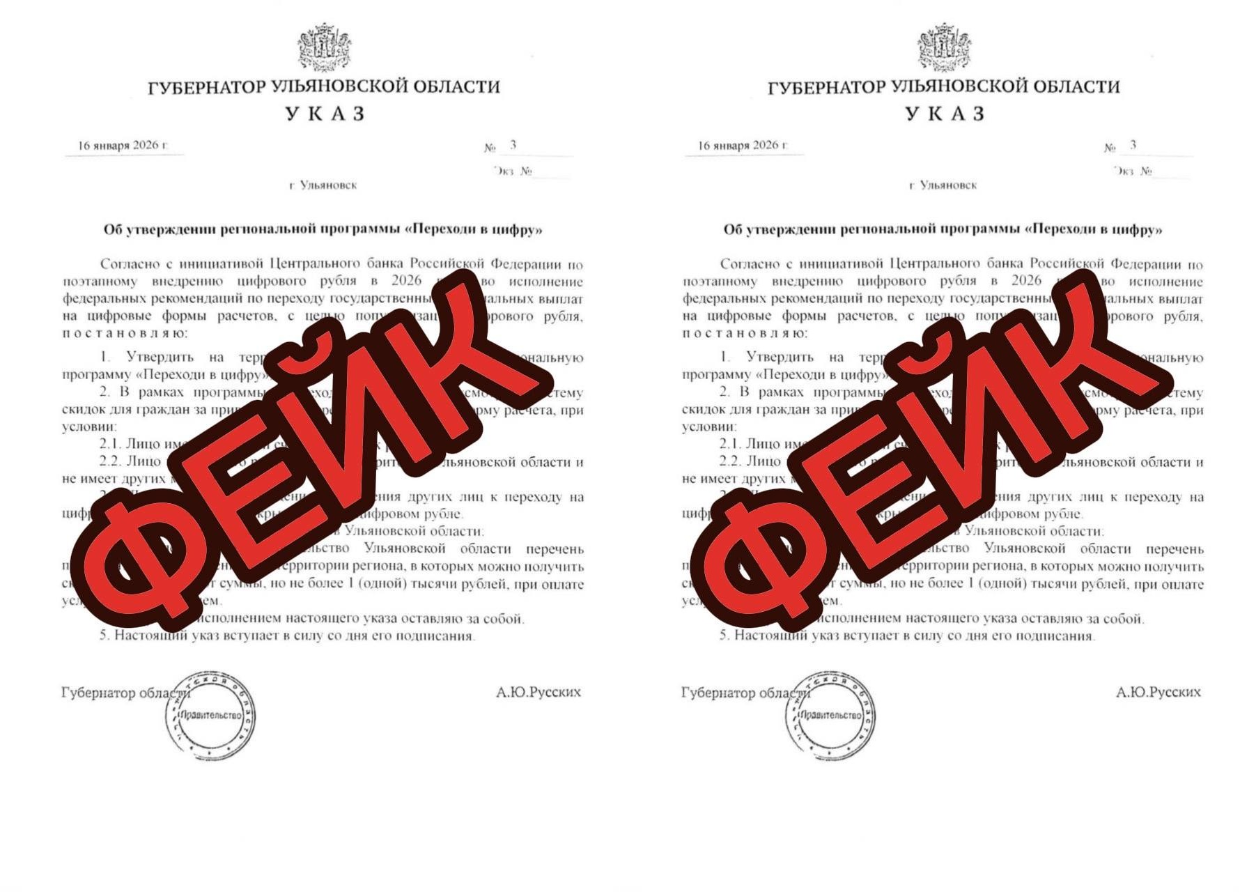 Министр финансов Ульяновской области Наталья Брюханова официально опровергла информацию о якобы принятом в регионе указе о переходе на цифровую систему расчетов. Распространяемый в сети документ за подписью губернатора Алексея Русских о переводе социальных выплат в цифровой рубль является фальшивкой.