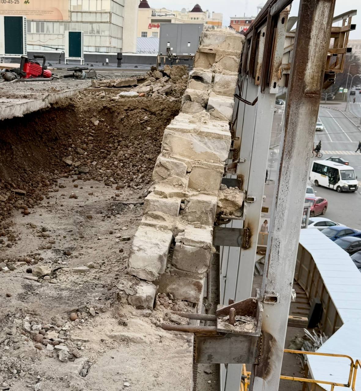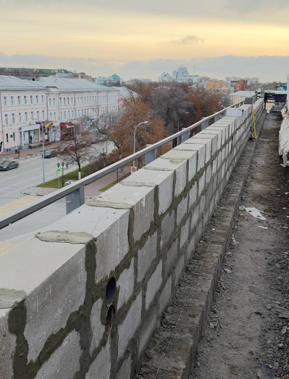 В связи с этим проектировщиками и строителями было принято безотлагательное решение: полностью разобрать старый парапет и возвести на его месте новый, аналогичный. В настоящее время рабочие завершают демонтаж старого ограждения и параллельно ведут кладку современной, прочной и безопасной конструкции.