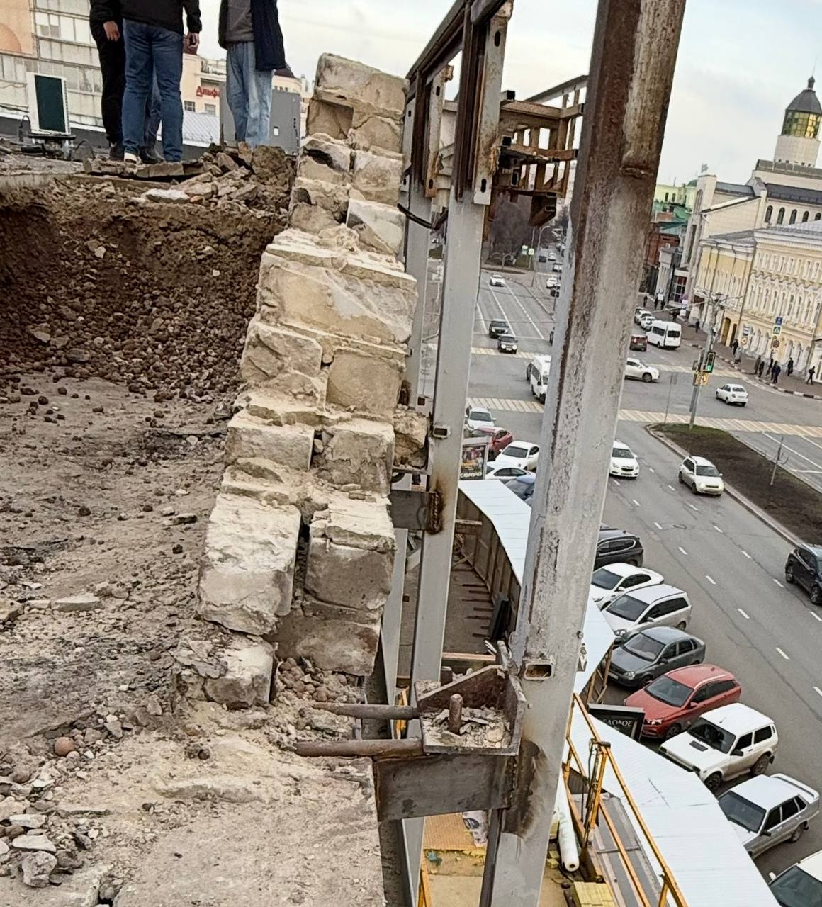 В процессе демонтажа старых и аварийных элементов фасада перед специалистами открылась новая серьезная проблема. После удаления рекламных конструкций стало очевидно, что кирпичный парапет на крыше, возведенный еще при строительстве здания, находится в катастрофическом состоянии. Конструкция была частично разрушена и, что самое опасное, имела заметный наклон в сторону тротуара.