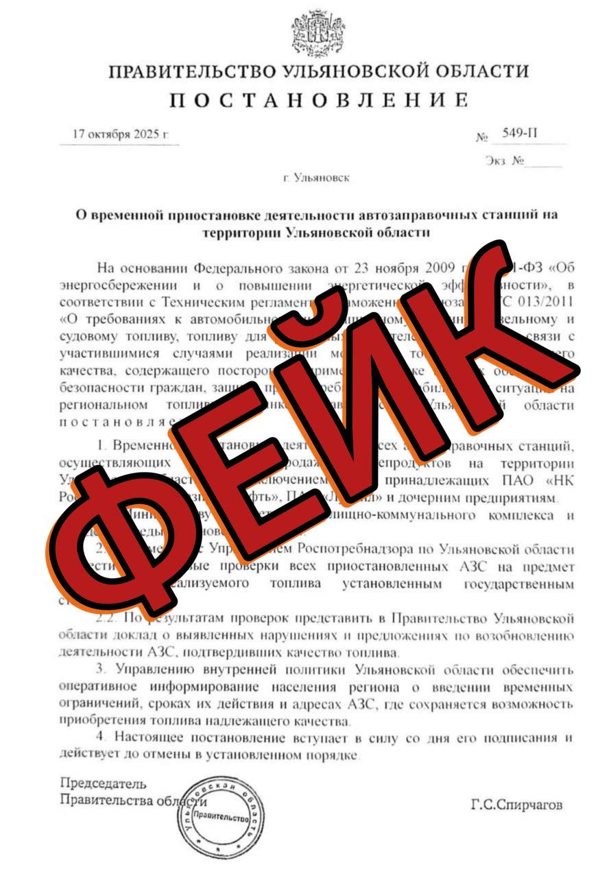Центр управления регионом (ЦУР) Ульяновской области выявил в информационном пространстве поддельный документ, в котором говорится о приостановке работы ряда автозаправочных станций. Основанием для этого в фальшивке называются участившиеся случаи продажи некачественного топлива.