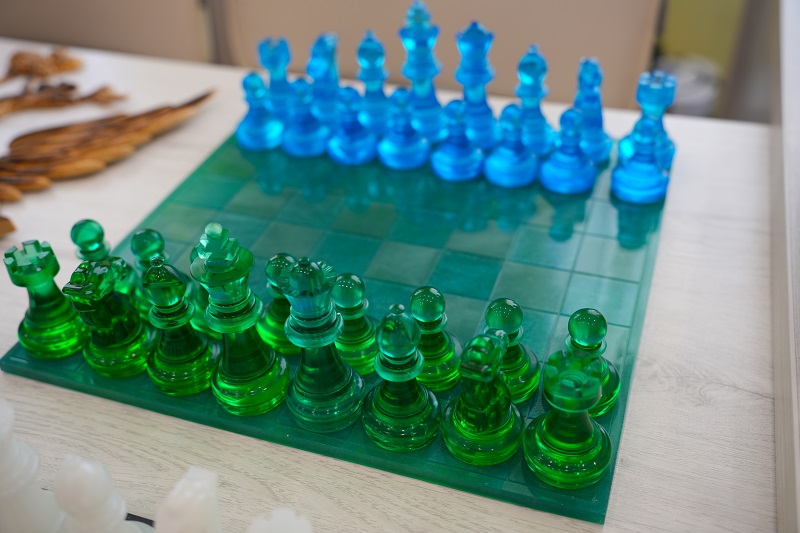 Помимо дерева, в колонии начали использовать эпоксидную смолу. Из нее делают шахматы: за счет добавок материал приобретает фактуру, напоминающую мрамор, камень или металл. Каждое изделие получается уникальным по цвету и текстуре.