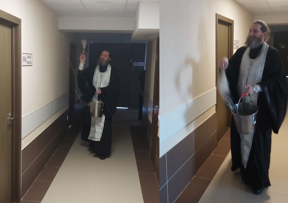 Священники начали встречу с молитвы в домовом храме на территории центра, после чего совершили чин освящения всего здания. Окропление святой водой прошло на всех пяти этажах — в лечебных и административных кабинетах, а также в комнатах для членов семей участников СВО.