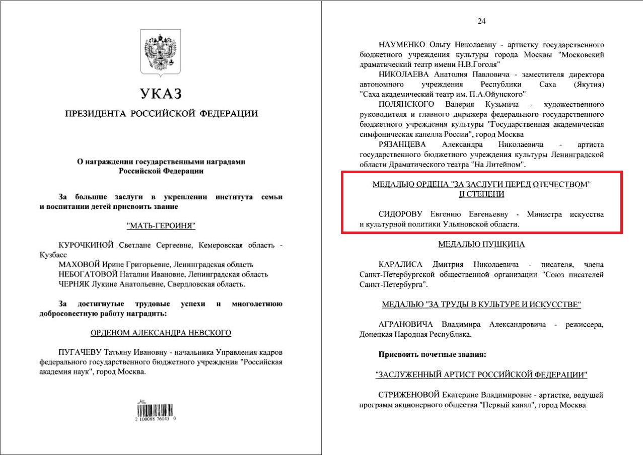 Министр искусства и культурной политики Ульяновской области Евгения Сидорова удостоена государственной награды.