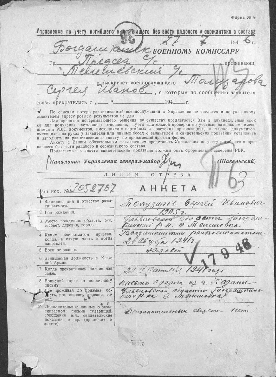 Сергей Толузаров ушёл на фронт в августе 1941 года. Уже в сентябре его семья получила последнюю весточку от него, а затем его имя навсегда пропало в списках без вести пропавших.