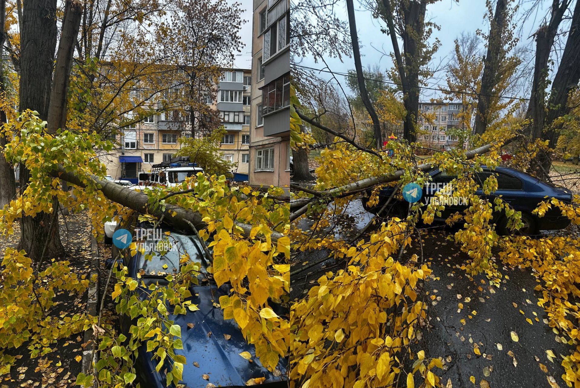 На припаркованный автомобиль упало дерево, сообщают пользователи сетей.