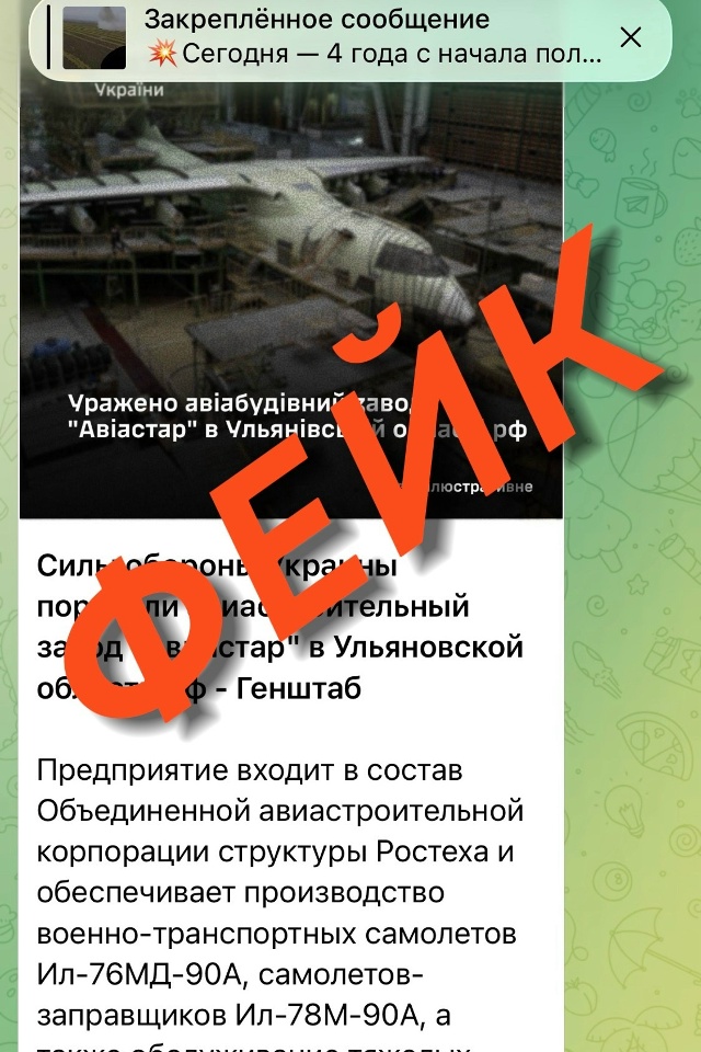 В социальных сетях и Telegram-каналах появилась информация, приписываемая Генштабу Украины, о якобы имевшей место атаке беспилотников на ульяновский авиастроительный завод «Авиастар». Сообщалось о поражении климатического укрытия и мест стоянки самолётов.