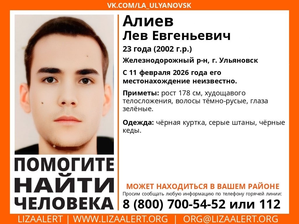 В Ульяновске ведутся поиски 23-летнего молодого человека. Лев Евгеньевич Алиев, 2002 года рождения, ушел из дома в Железнодорожном районе областного центра 11 февраля 2026 года. С того момента его местонахождение неизвестно.