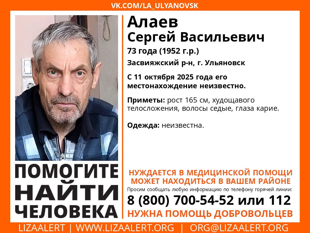 Сергей Васильевич Алаев, 73-х лет от роду, пропал без вести 11 октября 2025 года, в Засвияжском районе города Ульяновска.
