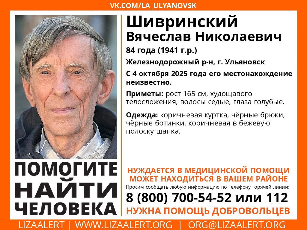 4 октября в Железнодорожном районе Ульяновска пропал 84-летний Шивринский Вячеслав Николаевич. Пенсионер не вернулся домой, и уже несколько дней о его судьбе ничего не известно.