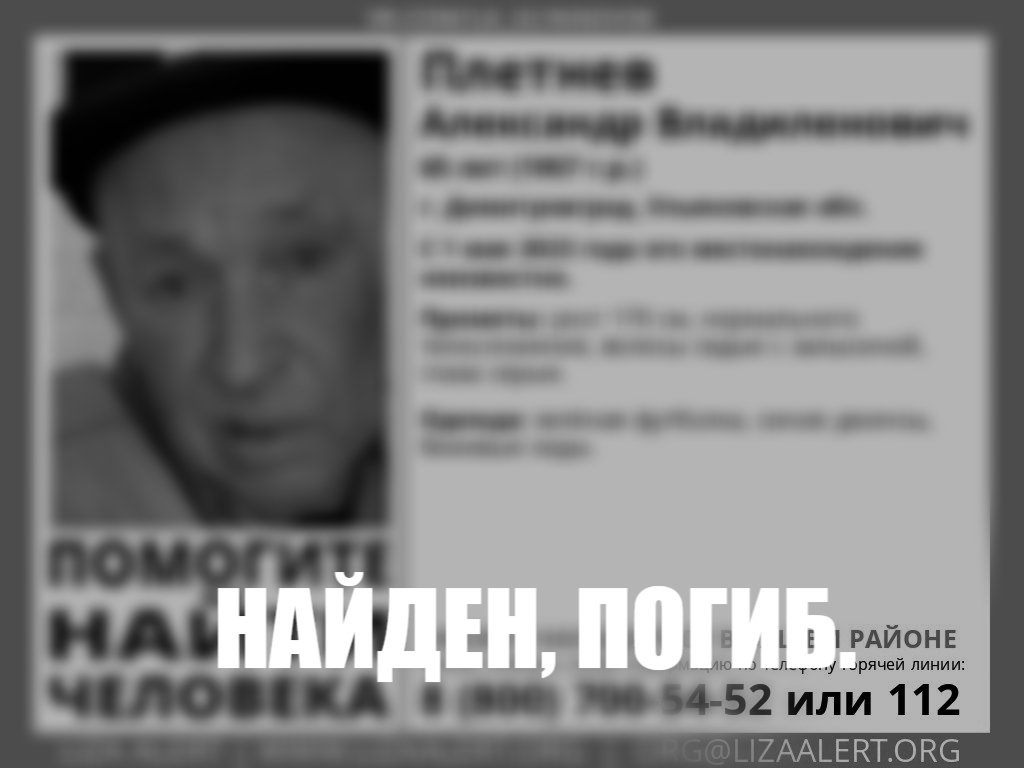 Поисковый отряд «ЛизаАлерт» сообщил о завершении долгих поисков. 65-летний Александр Плетнёв, который пропал без вести в Димитровграде 1 мая 2023 года, найден погибшим.