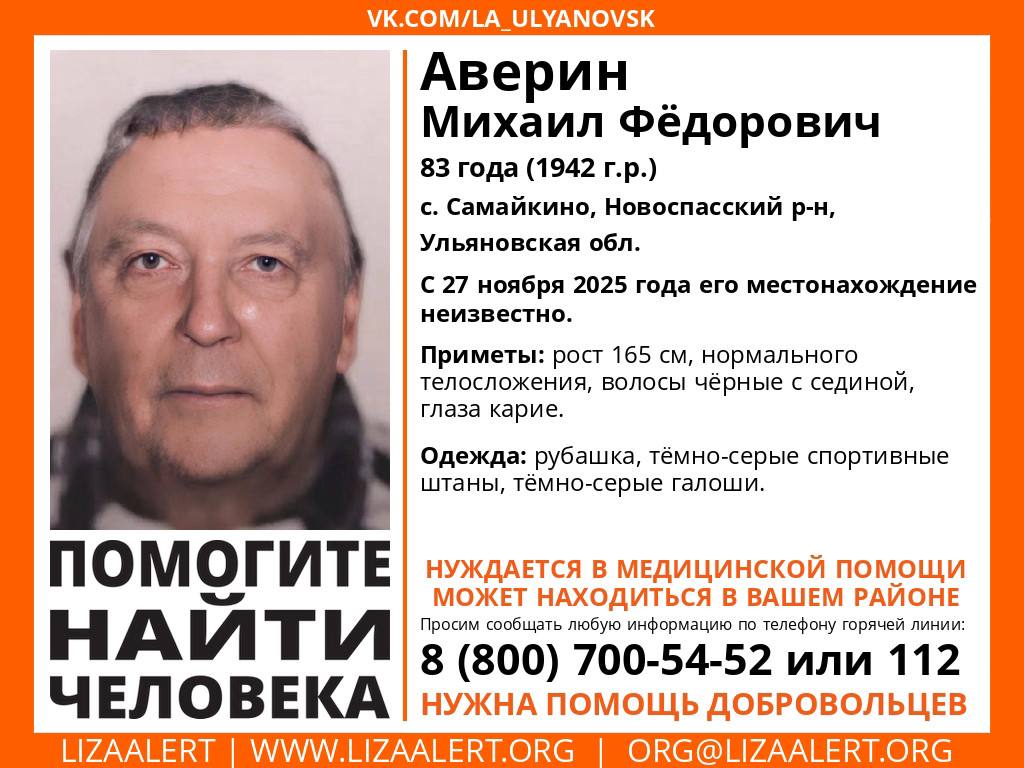 Разыскивается Аверин Михаил Фёдорович 1942 года рождения, 83 лет, который пропал 27 ноября 2025 года в селе Самайкино Новоспасского района Ульяновской области. Приметы: рост примерно 165 см, телосложение нормальное, волосы чёрные с сединой, глаза карие. На момент исчезновения на нём была рубашка, тёмно-серые спортивные штаны и тёмно-серые галоши.