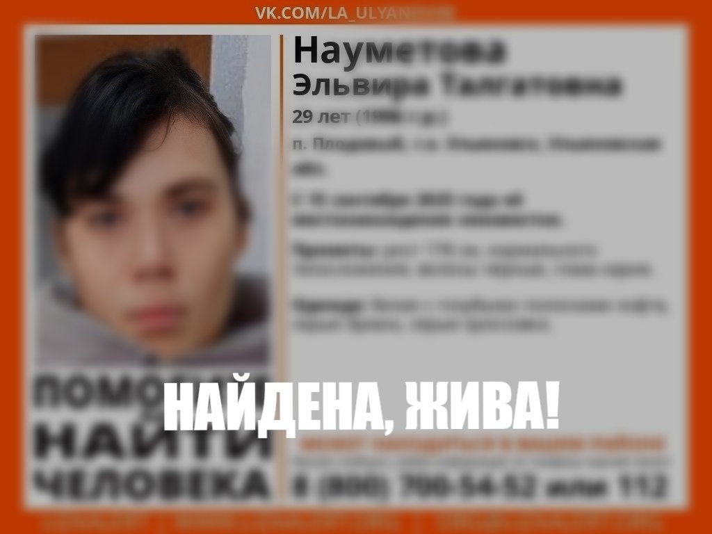 В Ульяновске завершились успехом полуторамесячные поиски 29-летней Эльвиры Науметовой, которая бесследно исчезла 15 сентября 2025 года. Радостную новость о том, что девушка найдена живой, 28 октября сообщили волонтёры поискового отряда «Лиза Алерт».