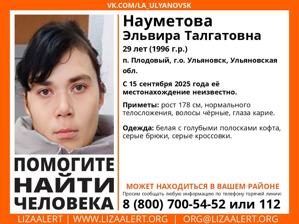 В Ульяновске разыскивают 29-летнюю Эльвиру Науметову, которая пропала без вести 15 сентября 2025 года. Молодая женщина исчезла в посёлке Плодовый городского округа Ульяновск.