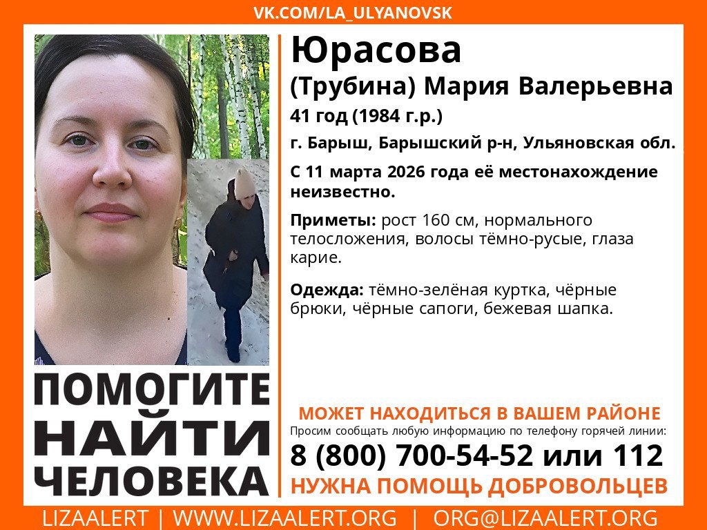 В Ульяновской области разыскивают Юрасову (Трубину) Марию Валерьевну, 41 год (1984 г.р.). Женщина пропала 11 марта 2026 года в городе Барыш (Барышский район) и до сих пор ее местонахождение неизвестно.