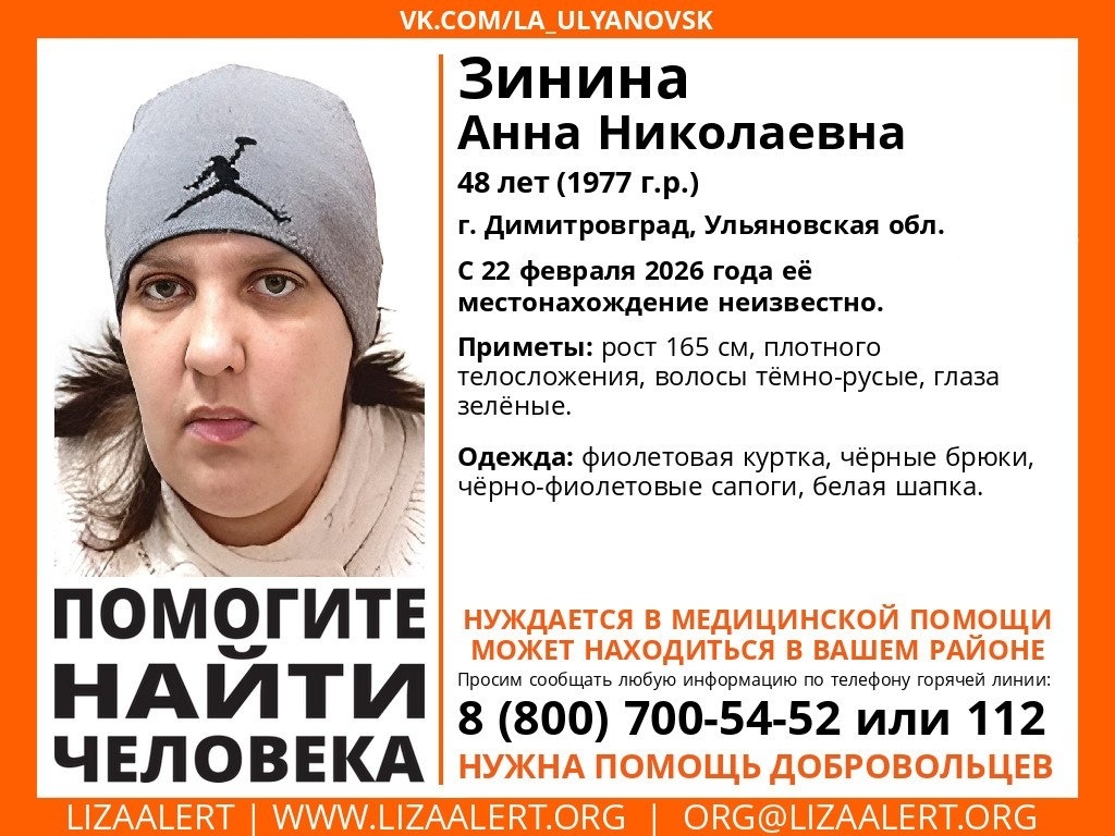 В городе Димитровграде Ульяновской области ведутся поиски 48-летней Анны Николаевны Зининой, которая пропала 22 февраля 2026 года. Женщина 1977 года рождения ушла из дома и до настоящего времени ее местонахождение неизвестно.