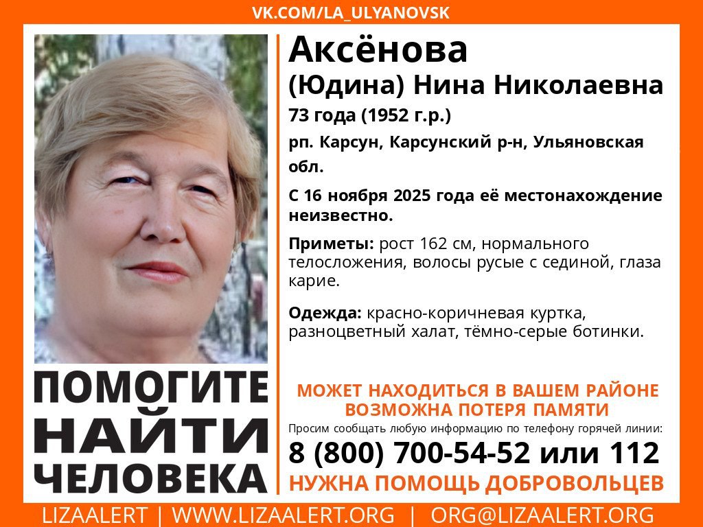В Карсунском районе Ульяновской области объявлены поиски 73-летней Нины Николаевны Аксёновой (Юдиной). Женщина пропала 16 ноября 2025 года в районном центре.