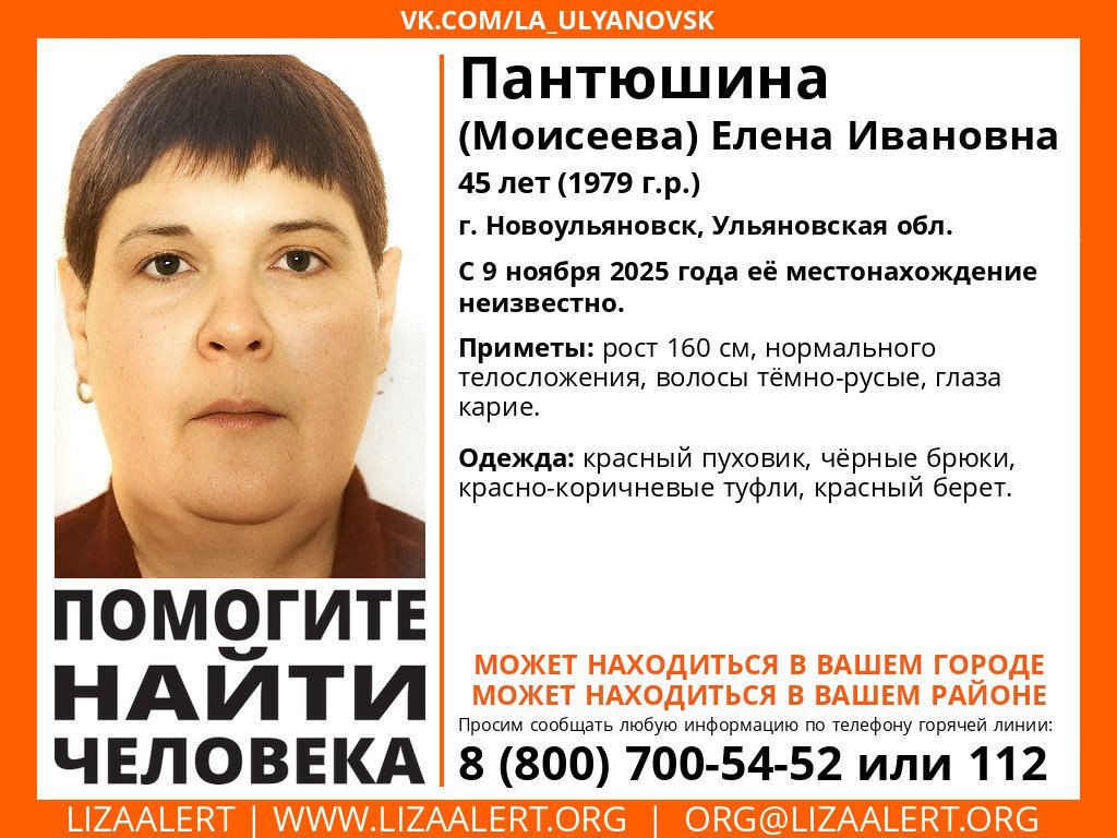 В городе Новоульяновске Ульяновской области продолжается поиск Елены Ивановны Пантюшиной (в девичестве Моисеевой), 1979 года рождения, которая пропала 9 ноября 2025 года. С того дня о ее местонахождении ничего не известно, что вызывает серьезную тревогу за ее жизнь и здоровье. Все, кто может предоставить какую-либо информацию, просят связаться по указанным контактам.