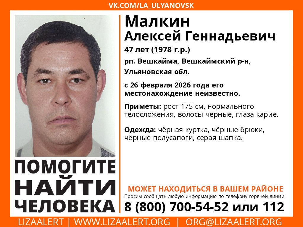 В Ульяновской области ведутся поиски 47-летнего Алексея Геннадьевича Малкина. Местонахождение мужчины неизвестно с 26 февраля 2026 года. В этот день он пропал в рабочем поселке Вешкайма (Вешкаймский район) и до настоящего времени не вышел на связь с родственниками и близкими.