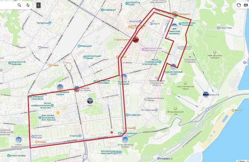 Стартует на площади Соборной. Участники бегут по эспланаде мимо памятника Карлу Марксу, затем сворачивают направо мимо здания Карамзинской библиотеки и выходят на бульвар Новый Венец. Финиш — у корпуса Ульяновского государственного педагогического университета.