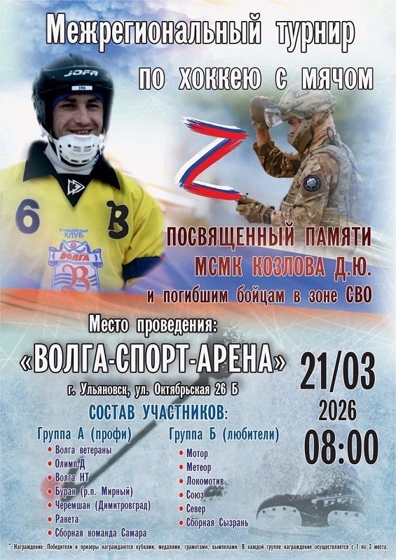 В ульяновском ледовом дворце «Волга-Спорт-Арена» дали старт межрегиональному турниру по хоккею с мячом. Соревнования посвящены памяти Дмитрия Козлова — мастера спорта международного класса, многолетнего капитана местной «Волги», чья жизнь оборвалась при выполнении боевых задач в зоне проведения СВО.