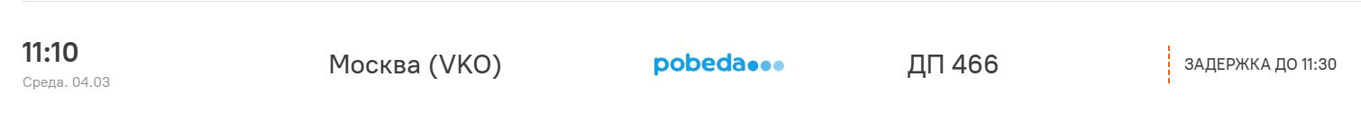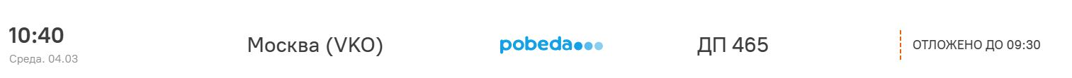 Вылет в Москву (аэропорт Внуково), рейс DP 466, запланированный на 11:10, задержан до 11:30.