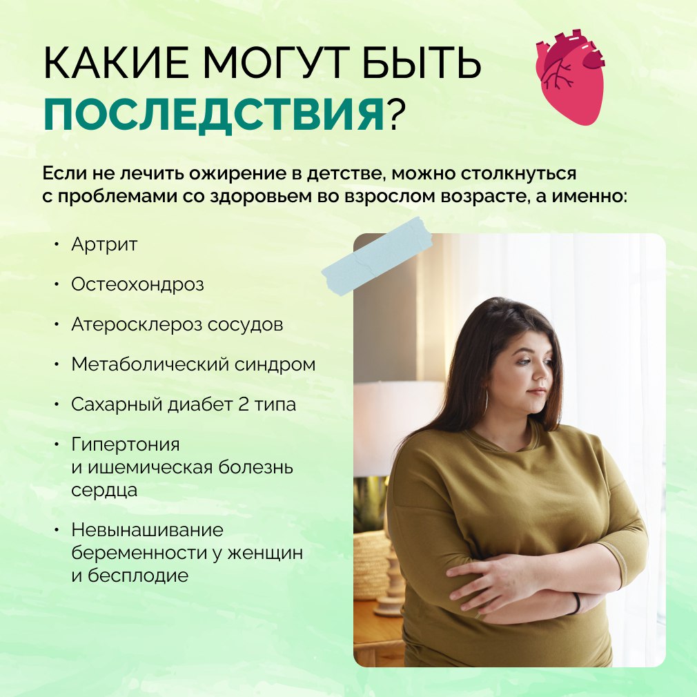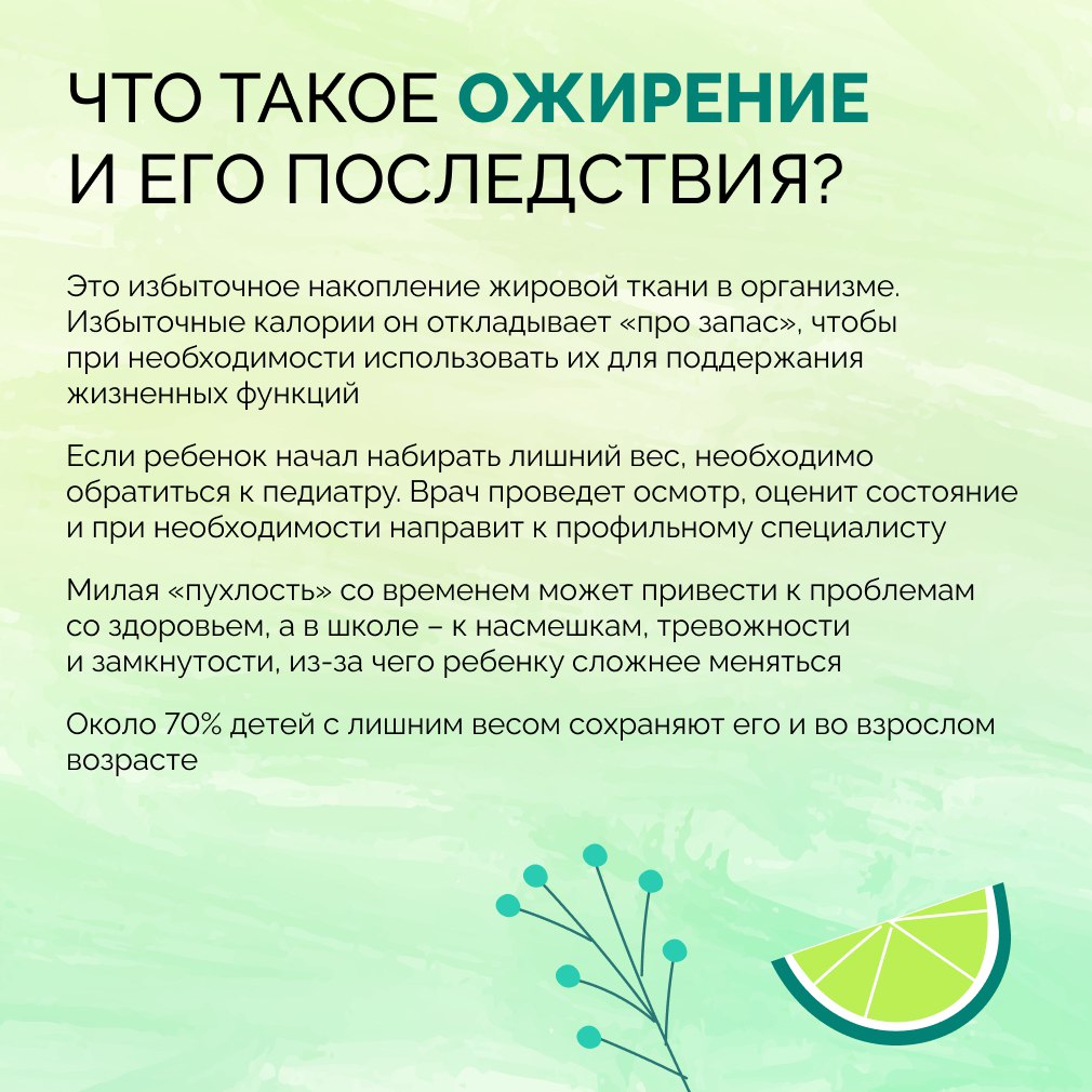 Специалист предупреждает: если ребёнок начал набирать лишний вес, необходимо обратиться к педиатру. Врач проведёт осмотр, оценит состояние и при необходимости направит к профильным специалистам. Милая детская «пухлость» со временем может обернуться серьёзными проблемами со здоровьем — артритом, остеохондрозом, атеросклерозом, гипертонией, сахарным диабетом второго типа и даже бесплодием. Кроме того, около 70 процентов детей с лишним весом сохраняют его и во взрослом возрасте, а в школе такие дети нередко сталкиваются с насмешками, тревожностью и замкнутостью, что мешает им меняться.