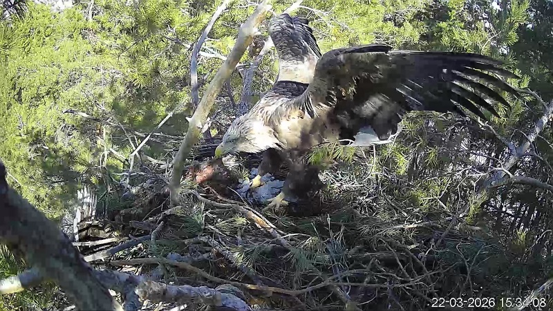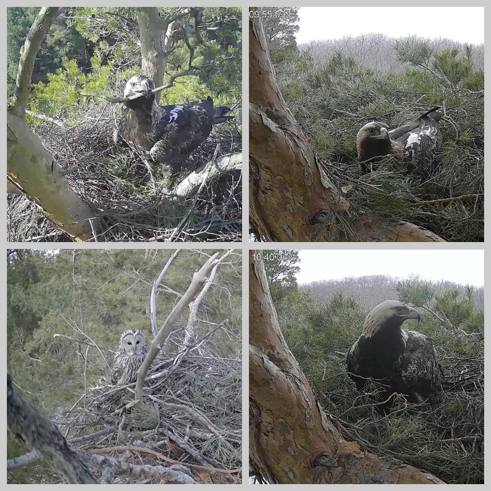 В одном из наблюдаемых гнёзд белохвостов орланы демонстрируют брачную активность эпизодически: пару раз отмечалось обновление постройки, вокальные дуэты и спаривание. Самец даже предпринял попытку угостить партнёршу добычей, что, однако, привело к конфликту — пернатые устроили потасовку из-за корма. Жилище постепенно обрело ухоженный вид, однако хозяева не спешат приступать к яйцекладке. Более того, однажды вечером на чужую территорию заявилась длиннохвостая неясыть — похоже, она всерьёз присматривалась к удобному гнездовому лотку, раздумывая, не занять ли его под собственное потомство.