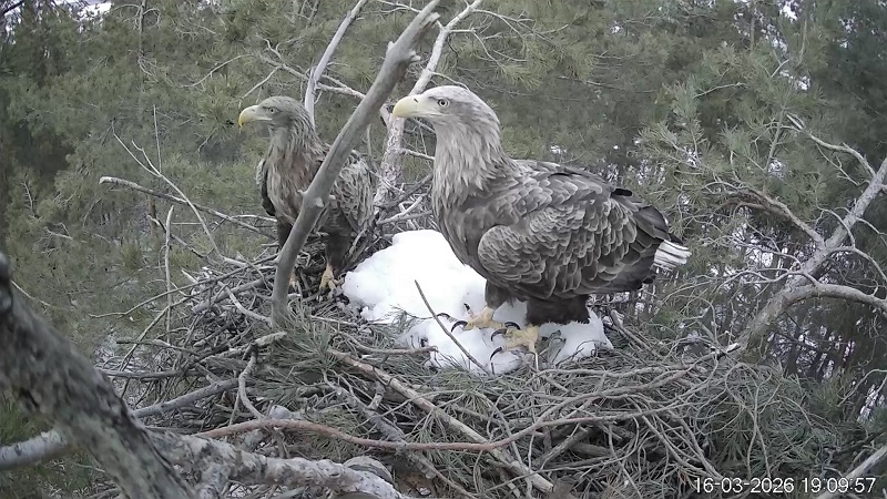 Тем временем ситуация на гнезде орланов-белохвостов долгое время вызывала опасения: последнее время там появлялся лишь один орлан, и то изредка. Это наводило на мысли, что другие пары уже приступили к насиживанию кладок. Однако сегодня вечером на гнезде вновь замечена пара, которая занималась укладкой веточек. Это даёт надежду, что птицы всё же решатся на гнездование.