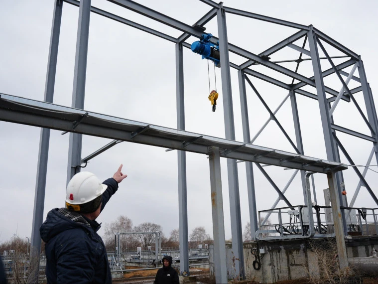 На 85% готовы переходные мостики для доступа к аэротенкам и наружные инженерные сети. Также смонтированы опоры под систему электроснабжения и начата установка затворов.