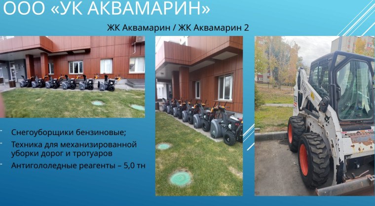 Как сообщила директор УК «Аквамарин» Анна Зайцева, в компании работают более 30 дворников, которые полностью обеспечены необходимым инструментом и ручными снегоуборщиками. Это позволяет обслуживать дворы общей площадью около 300 тысяч квадратных метров. На случай сильных снегопадов компания готова арендовать дополнительную спецтехнику по заранее заключенным договорам.