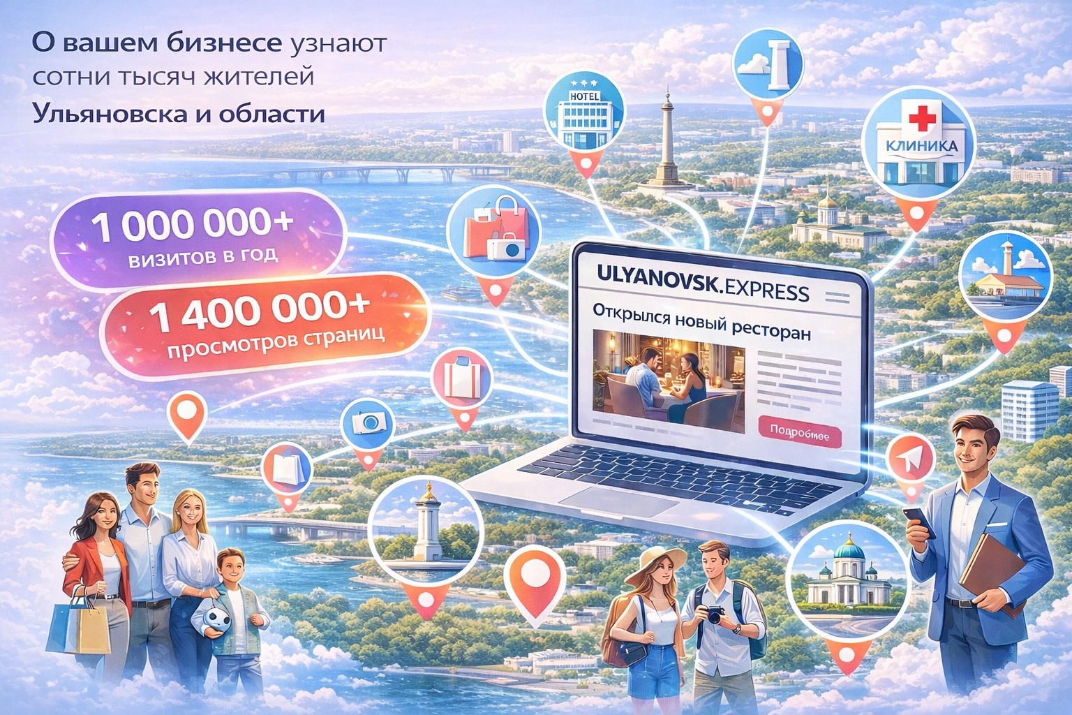 Размещение рекламы на официальном новостном портале ULYANOVSK.EXPRESS даст Вам не только поток потенциальных клиентов для Вашего бизнеса, но и повысит медийность, присутствие в медиасфере Вашей компании, продукта, услуги, что значительно повысит доверие аудитории.